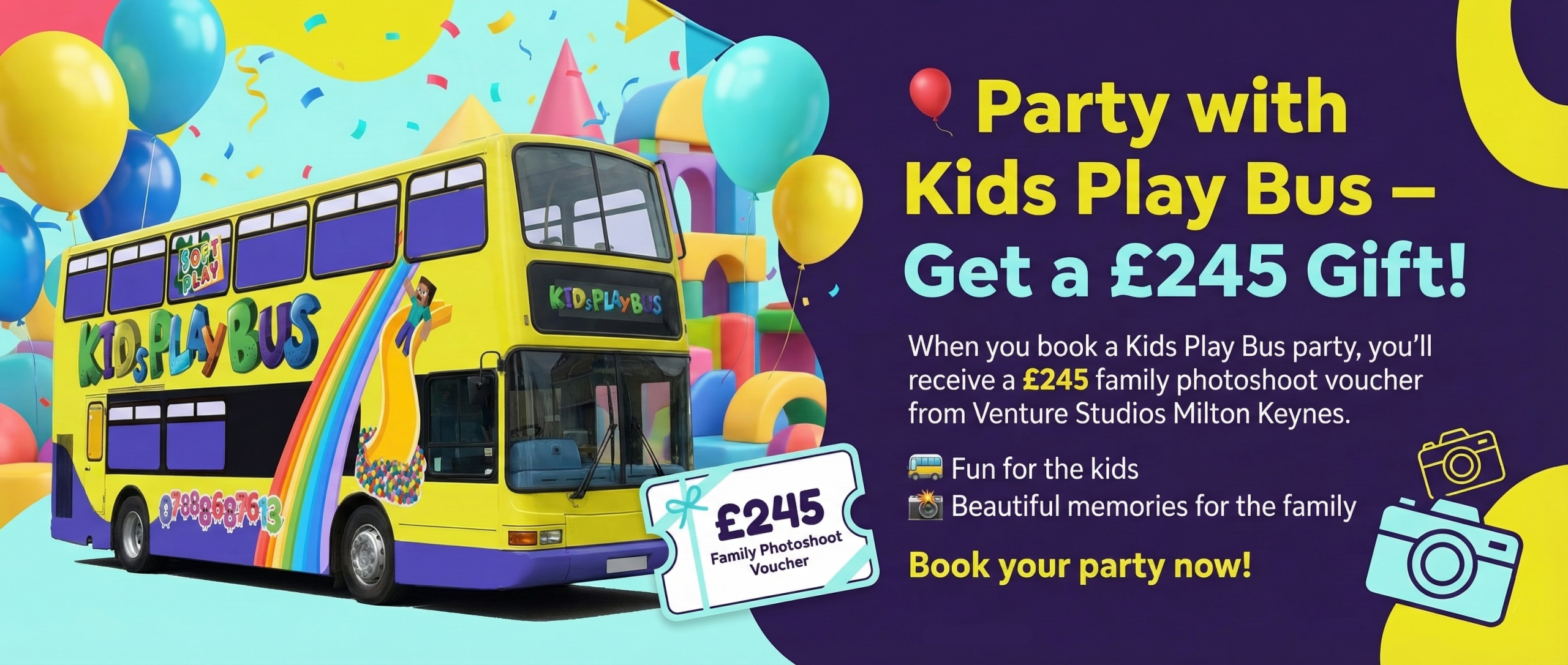 - Get in Touch: Call 07888 687 613 or email info@kidsplaybus.com to discuss your wedding and our availability.